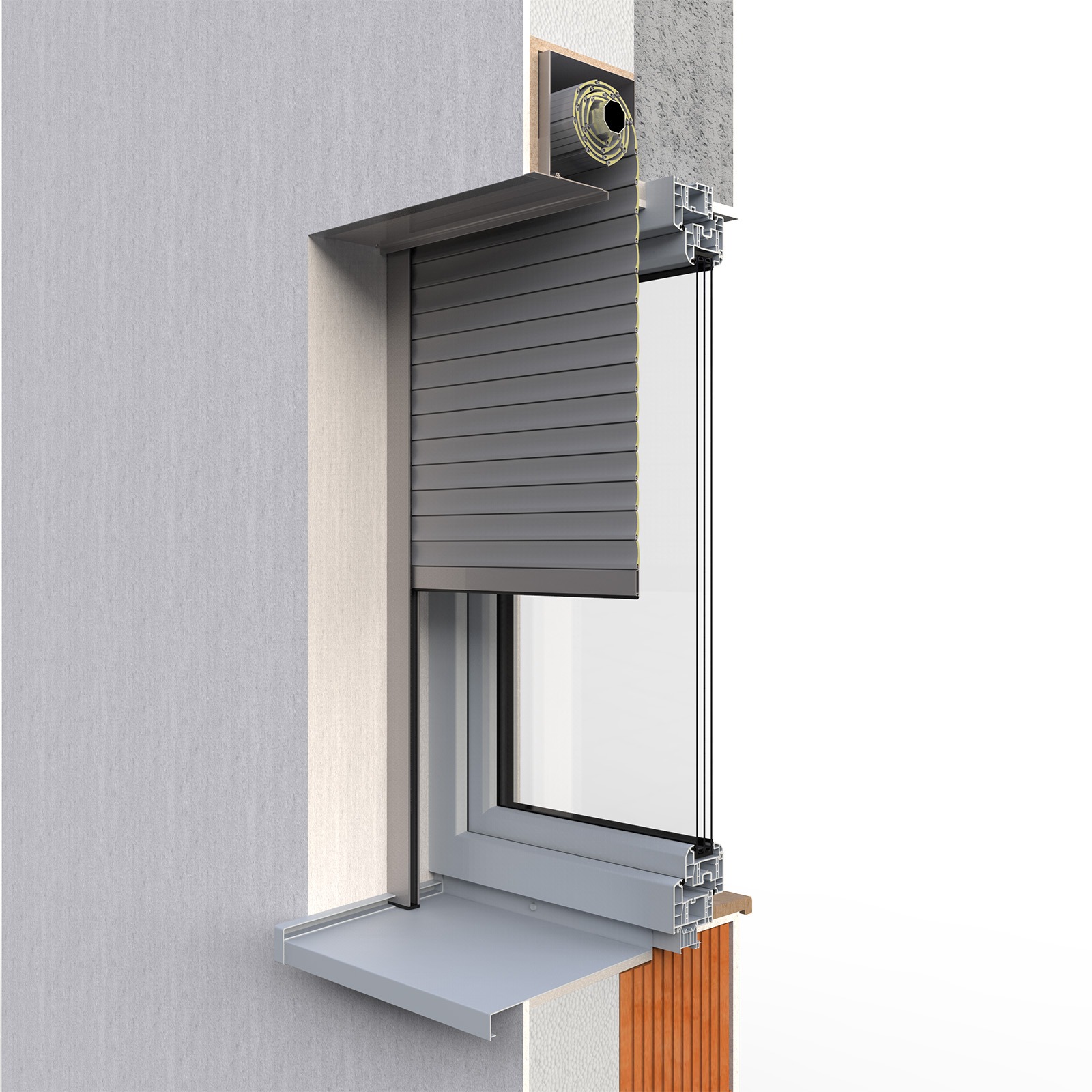 Návin lamel venkovní hliníkové rolety je skrytý v podomítkovém boxu, který se instaluje přímo na zdivo, vyrovná se zateplovacími panely a poté zaomítne. Toto elegantní a čisté řešení je ideální pro novostavby i rekonstrukce.